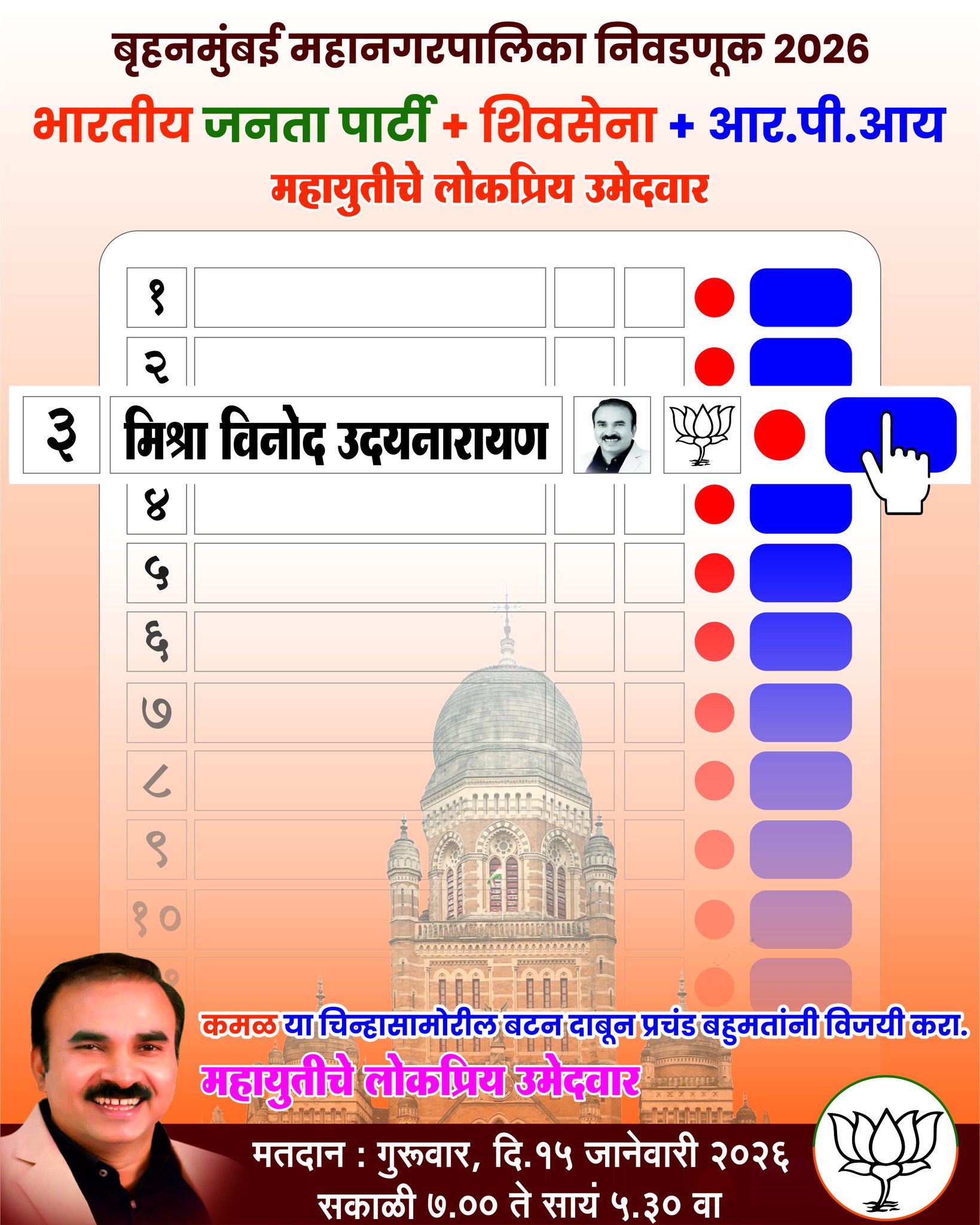 Vinod Udaynarayan Mishra entered public life as a young BJP karyakarta and rose through organisational roles. As BJP Group Leader in the Brihanmumbai Municipal Corporation, he has represented both his ward and the party on city‑wide civic issues. He is the Mahayuti candidate for Ward 43 in the upcoming elections.